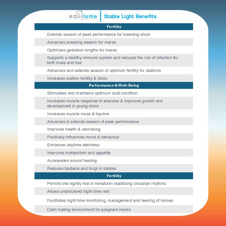 The Equilume Stable Light will help maximize your horse’s fertility, performance and well-being by naturally strengthening circadian and circannual rhythms.